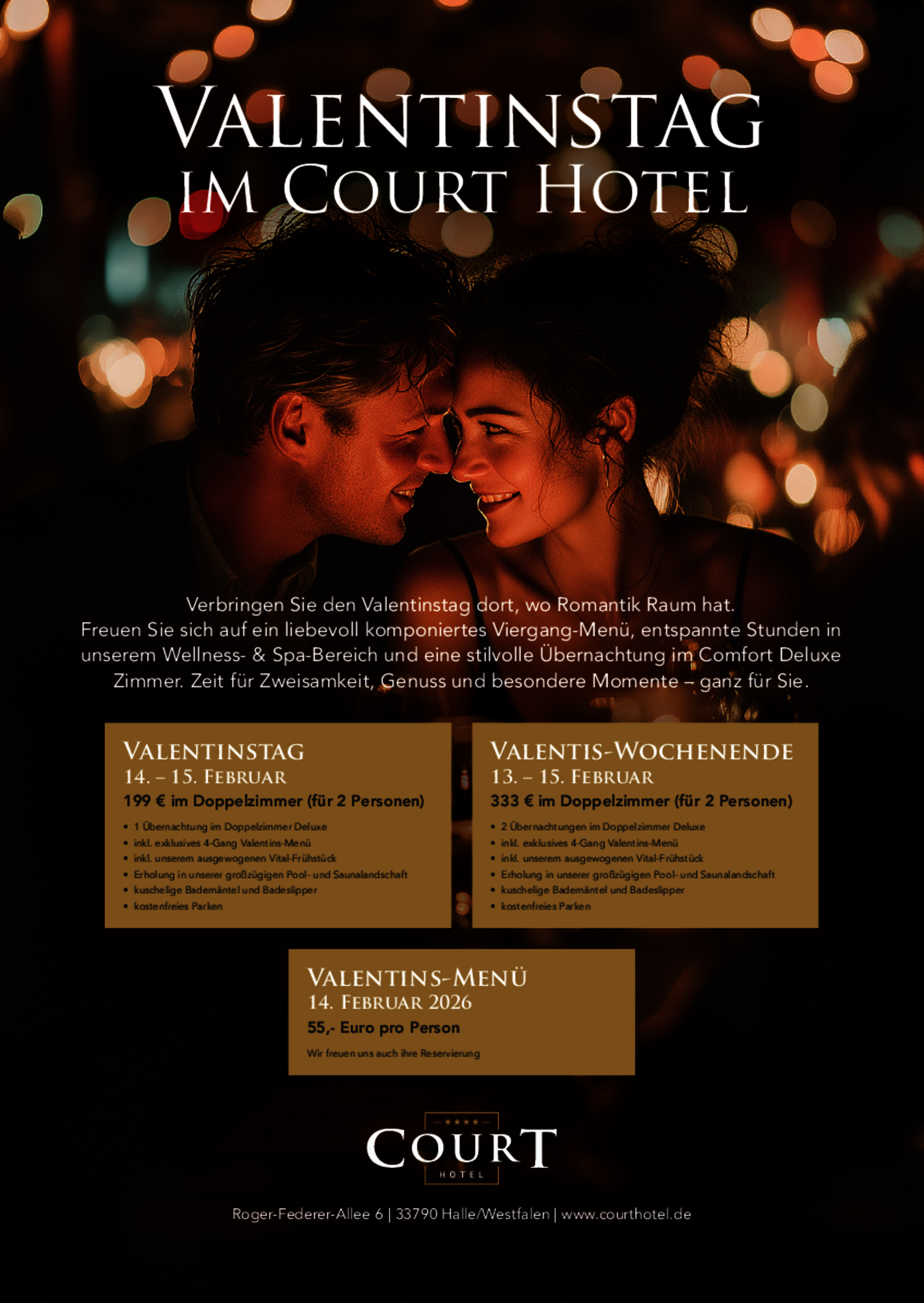 Genießen Sie ein exklusives 4-Gang-Valentins-Menü – wahlweise mit Übernachtung oder als romantisches Valentins-Wochenende inklusive Wellness & Spa.